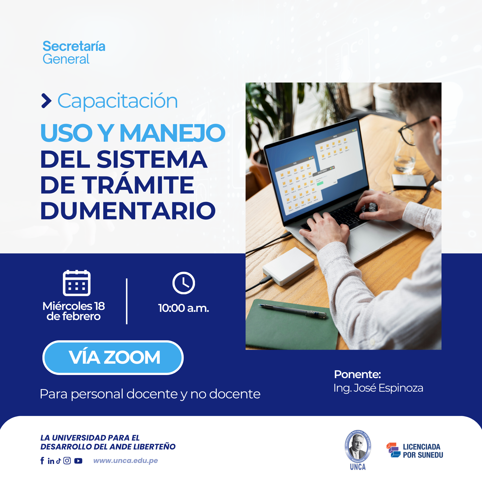 La capacitación se realizará el miércoles 18 de febrero a las 10:00 a.m., vía Zoom, y estará a cargo del Ing. José Espinoza. Esta actividad permitirá optimizar los procesos administrativos, mejorar la eficiencia en la atención de trámites y garantizar una correcta gestión documentaria en la universidad.